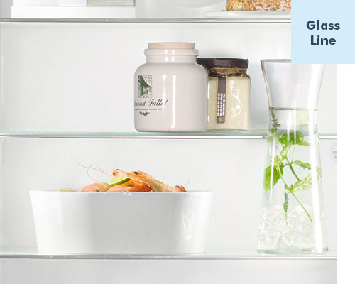 Stylowe wyposażenie GlassLine, to połączenie perfekcyjnego wykonania z atrakcyjnym designem. Eleganckie, szklane półki z hartowanego szkła są łatwe do mycia oraz posiadają wysoką wytrzymałość na obciążenia. Zarówno szklana dzielona półka, wsuwana jedna pod drugą, jak i pozostałe półki mogą zostać umieszczone na dowolnej wysokości wnętrza urządzenia.