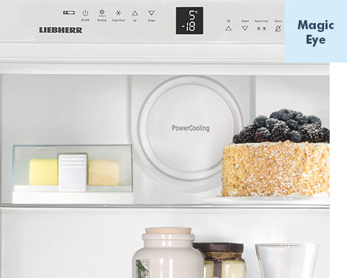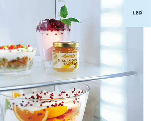 Urządzenie z serii Premium jest wyposażone w kolumny oświetleniowe LED, zintegrowane po obu stronach wnętrza oraz w strefie BioFresh. Satynowane obudowy kolumn emitują przyjemne i wysokowydajne światło. Jednocześnie kolumny umożliwiają ustawianie szklanych półek na różnych wysokościach. Dodatkowe, płaskie oświetlenie sufitowe LED zapewnia równomierne światło w chłodziarce.