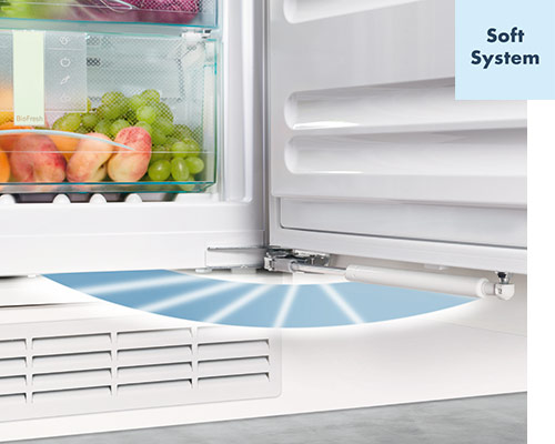 SoftSystem to innowacja zapewniająca jeszcze większą wygodę i bezpieczeństwo. Wbudowany w drzwiach urządzenia mechanizm tłumi ruch oraz pozwala na delikatne zamknięcie drzwi, nawet przy ich pełnym załadowaniu produktami. Drzwi zamykają się automatycznie od kąta otwarcia wynoszącego ok. 30°.