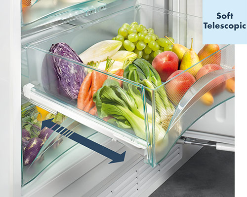 SoftTelescopic to wygodny i bezpieczny mechanizm zapewniający delikatne i samoczynne wsuwanie szuflad. Dzięki temu codzienne użytkowanie jest praktyczne, bezpieczne i komfortowe. Szuflady można całkowicie wysunąć przy kącie otwarcia drzwi wynoszącym 90°.