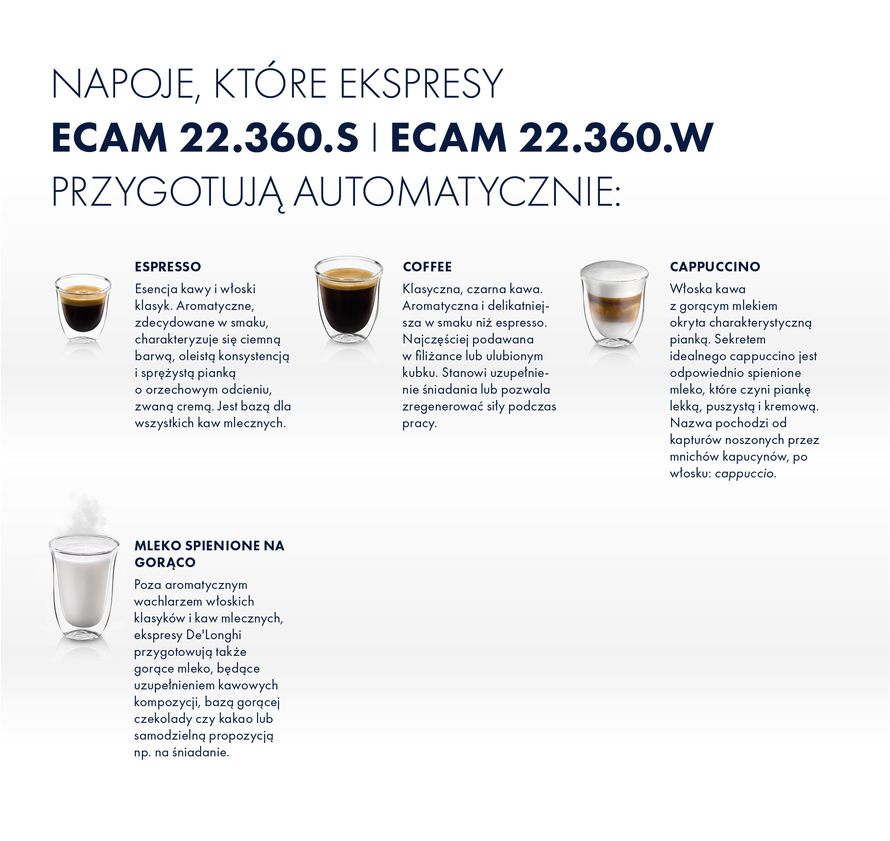 Marka De'Longhi, dbając o zagwarantowanie najwyższej funkcjonalności swoich produktów, wyposażyła ekspres ECAM 22.360.W w zintegrowany automatyczny system spieniania mleka. Sprawia on, że za jednym dotknięciem dedykowanego przycisku możesz przyrządzić perfekcyjne cappuccino z gęstą, kremową pianką, które zachwyci nawet najbardziej wymagającego kawosza. System, spieniając mleko, wykorzystuje wyłącznie taką ilość, która jest potrzebna do przygotowania mlecznej pianki, zatrzymując niewykorzystaną część w dzbanku. Po przygotowaniu kawy, karafka może być przechowywana w lodówce. Dzięki temu mleko będzie zawsze świeże i odpowiednio schłodzone.