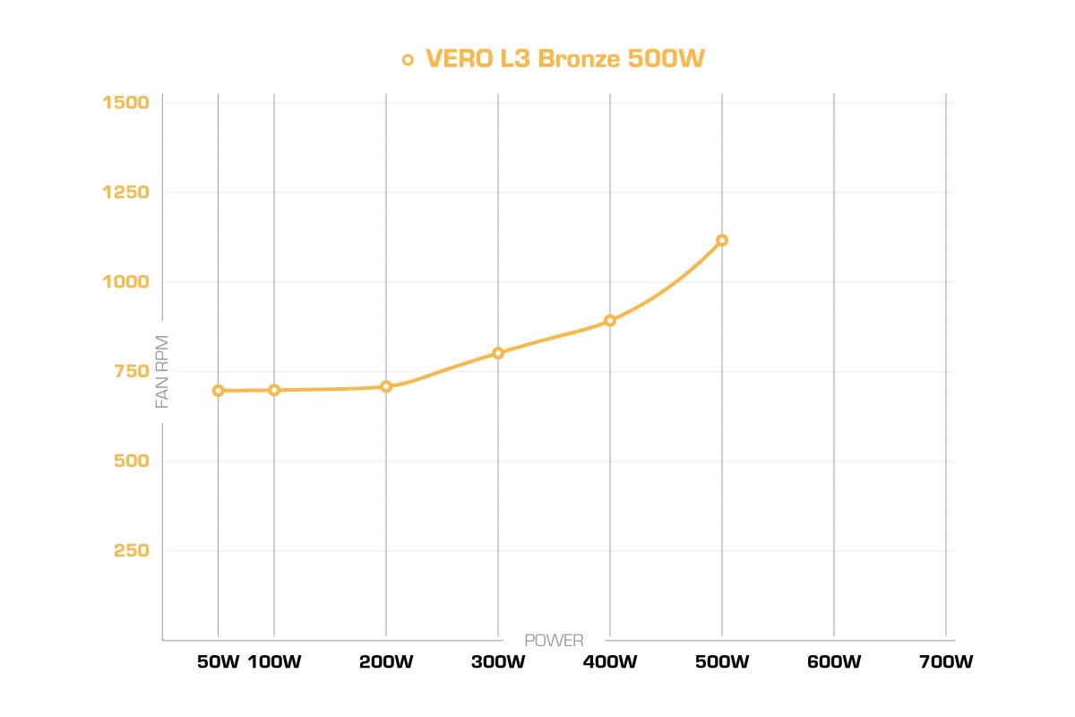 Wysoka sprawność to nie tylko niższe rachunki za prąd, to także mniejsza ilość wydzielanej energii cieplnej, a tym samym niższe temperatury we wnętrzu zasilacza i cichsze działanie. Dzięki temu, sterowany termicznie wentylator Sigma HP 120 mm z łożyskiem HBS może działać z bardzo niską prędkością (do 750 obr./min) aż do połowy obciążenia mocy znamionowej zasilacza Vero L3 500 W. Jednak nawet przy większym zapotrzebowaniu wentylator nie rozkręca się powyżej 1000 obr./min: do około 450 W. Tym samym, szum generowany przez wentylator jest wyraźnie cichszy niż w poprzedniej rodzinie zasilaczy Vero L2/M2.