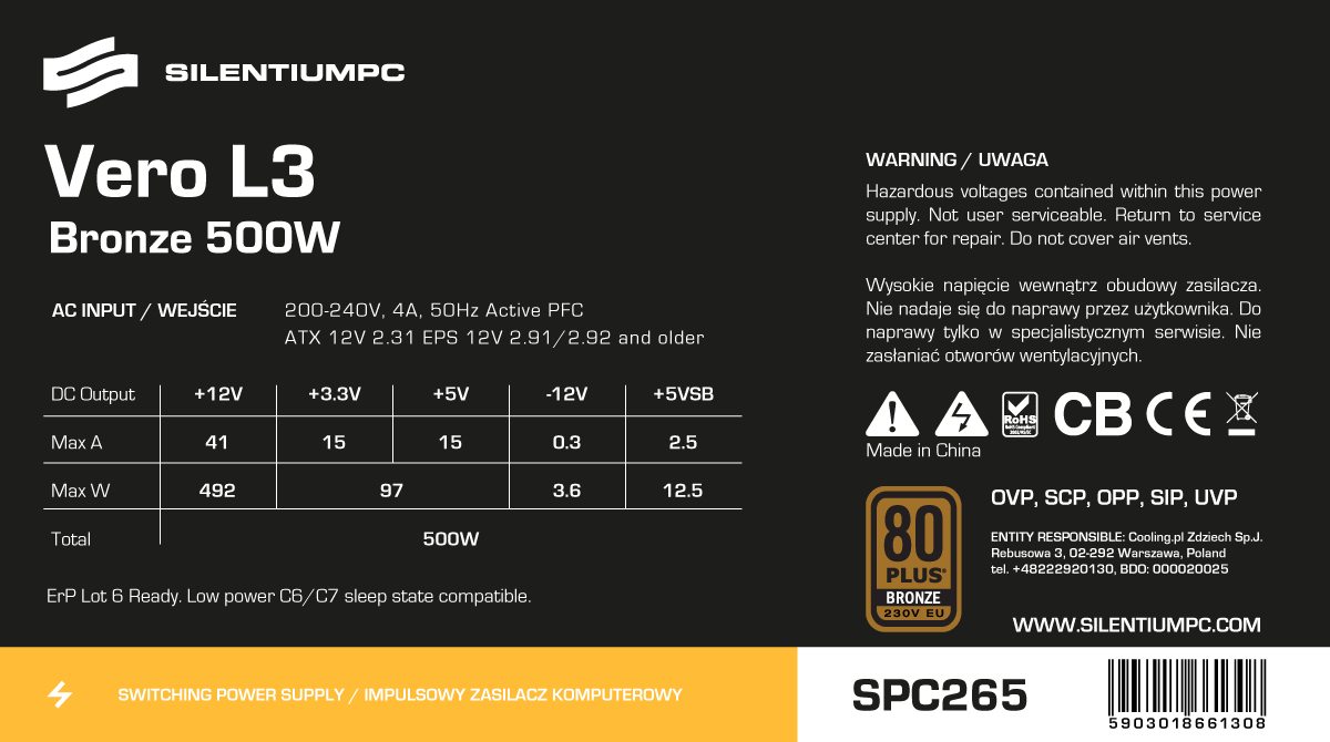 Zasilacz komputerowy ATX Vero L3 500 W to bardzo wysoka sprawność, potwierdzona certyfikatem 80 PLUS® Bronze 230V, nowoczesne i wydajne konwertery DC-DC, niezwykle mocna pojedyncza linia +12 V, bardzo ciche działanie w dużym zakresie obciążenia, a także bogaty zestaw płaskiego i czarnego okablowania. Potwierdzeniem wysokiej jakości jest 3-letnia gwarancja w wygodnym systemie door-to-door.